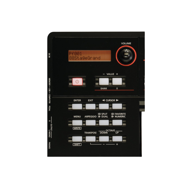 - Quick-access buttons for favorite sounds and split, layer, octave shift, and transpose functions